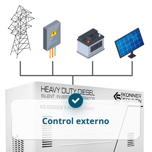 • Control externo – permite la conexión de dispositivos de gestión externos para encender/apagar el generador e integrarlo en sistemas automáticos que funcionan mediante contactos secos, como inversores solares, sistemas de alimentación ininterrumpida y otros.