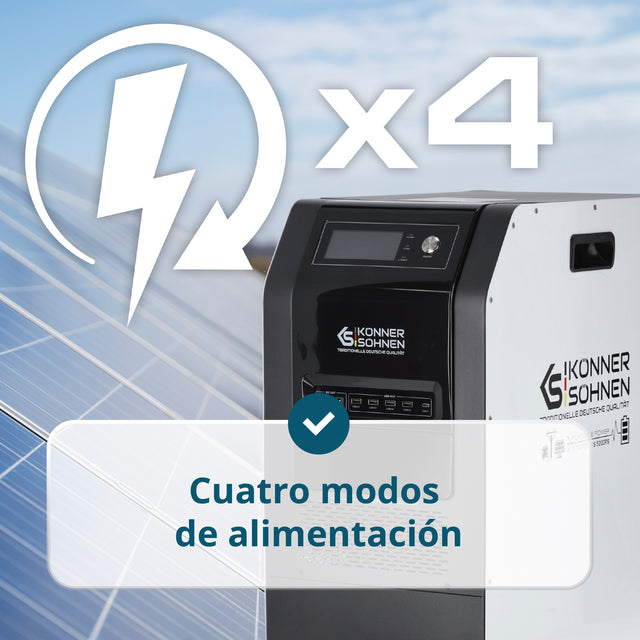 Salida 48V DC para generador o batería, Inverter con onda sinusoidal pura, LiFePO₄ 5,12 kWh, Controlador MPPT, UPS < 10 ms, Compatibilidad Tandem Power, Carga rápida hasta el 80 % en 1 hora, Protección contra sobrecarga y sobrecalentamiento, Pantalla LCD con monitoreo de parámetros, Ruedas y asas para transporte |