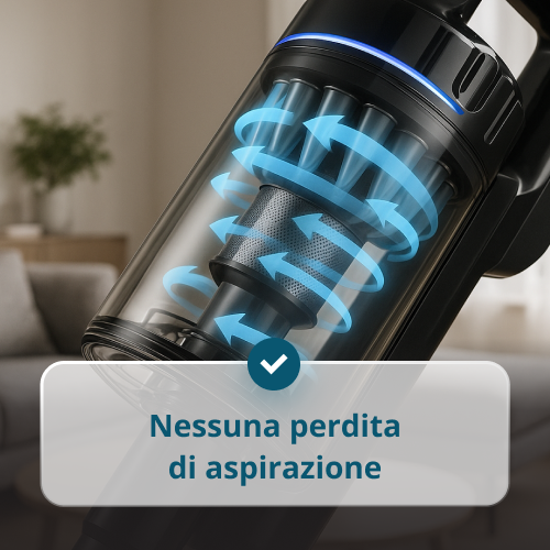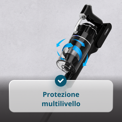 • Sistema multi-ciclone mantiene la potenza di aspirazione anche con il contenitore della polvere pieno.