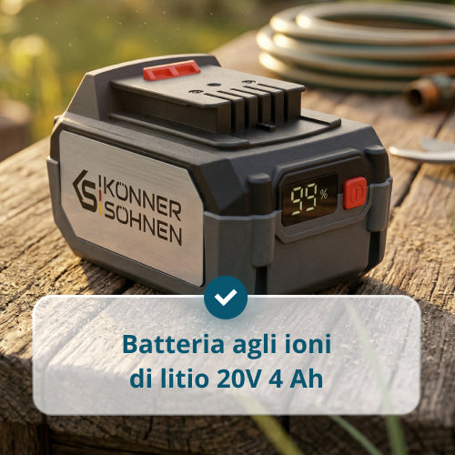 • Maximum benefit from purchasing the set — by buying the full cordless lawn care kit: lawn mower, garden trimmer, and dual charger, you get 2 x 4Ah batteries as a gift.