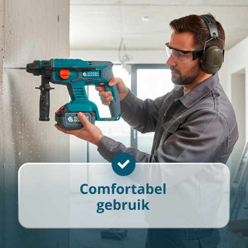 • Hoge kracht en veelzijdigheid – 60 Nm boormachine met 2 werkingsmodi: boren en schroeven, en 23 koppelinstellingen; haakse slijper met instelbare snelheid 2500–10.000 tpm; en boorhamer met 2 J slagenergie en 4 modi: boren, hamerboren, hamer met rotatie, en alleen hamer – allemaal geschikt voor verschillende taken.