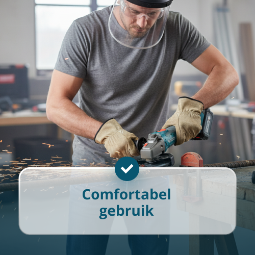 • Safe operation – the protection system includes overheating, overload, and over-discharge protection. Additionally, the angle grinder features a dual-sided anti-rotation protective guard and a tool-free gearbox lock system for user safety during operation.
