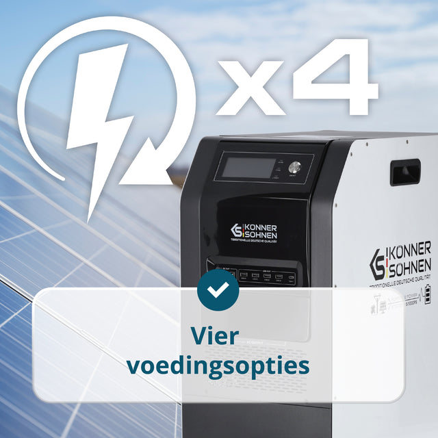 • Vier stroomvoorzieningsmethoden – stroom van het net, efficiënte zonne-oplading tot 80% in 1 uur, DC-generatoren of extra batterijen, en direct schakelen daartussen indien nodig.