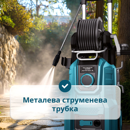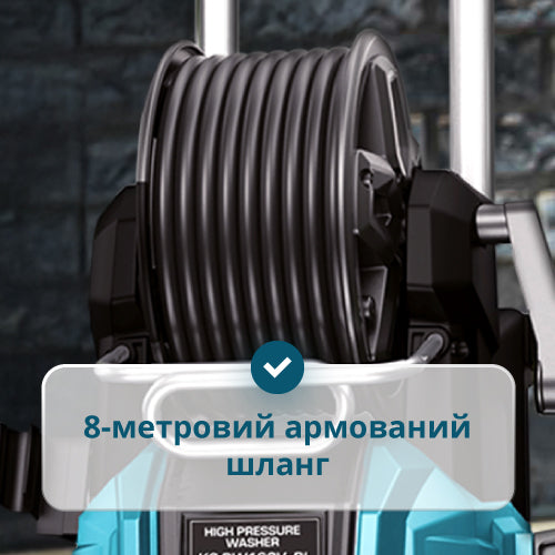 • Міцний 8-метровий армований шланг – витримує високий тиск і механічні навантаження, забезпечуючи довговічність і надійну роботу в будь-яких умовах.