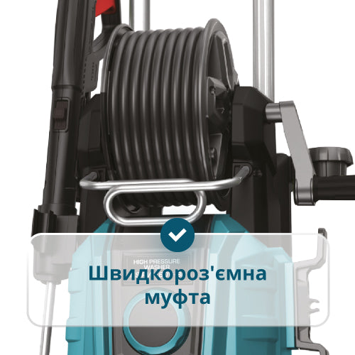 • Барабан із направляючою рамкою для високонапірного шланга – спрощує зберігання і допомагає уникнути перегинів, що подовжує термін служби шланга.