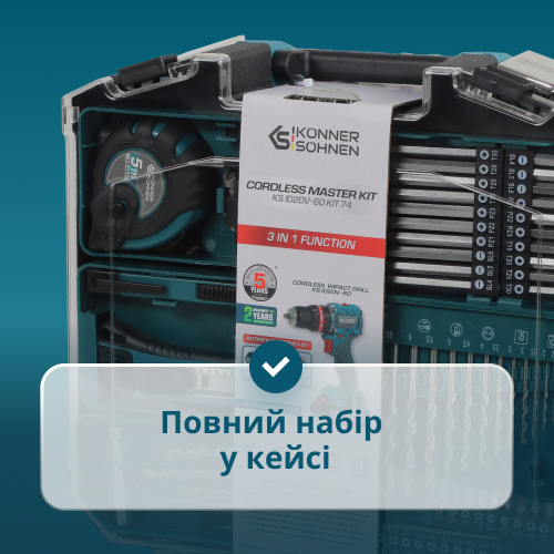 • Повний набір у кейсі - усе необхідне для роботи входить до комплекту: дриль, акумулятор 2 А·год, зарядний пристрій 2.4 А та набір із 74 аксесуарів — біти, свердла та насадки, усе зручно розміщено в кейсі, що спрощує зберігання, транспортування та робить дриль готовим до роботи одразу після розпакування.