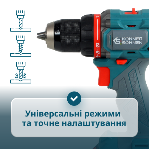 • Універсальні режими та точне налаштування - інструмент має 23 позиції крутного моменту, що забезпечують точне регулювання сили закручування під різні матеріали та типи кріплень, та 3 режими роботи — свердління, закручування та свердління з ударом  з ударною частотою до 28 500 уд/хв.